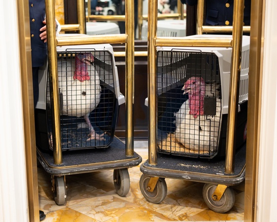 The 2025 Presidential Turkeys, named Gobble and Waddle, arrive at the Willard InterContinental Hotel in Washington, D.C., on Sunday, November 24, 2025., Credit:Andrea Hanks / Avalon