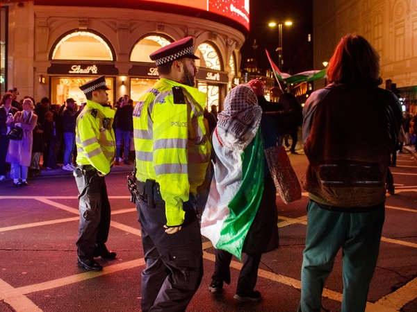 Palestine protesters from a range of groups, most notably Palestine Pulse block Piccadilly Circus on Black Friday, London, UK, 28 November 2025, Credit:Alex Day / Avalon