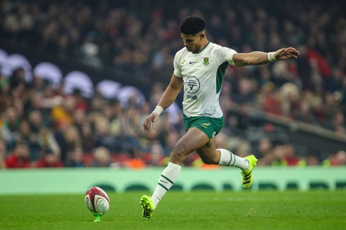 Sacha Feinberg-Mngomezulu of South Africa kicks a conversion during the Quilter Nations Series 2025 match Wales vs South Africa at Principality Stadium, Cardiff, United Kingdom, 29th November 2025, Credit:Andrew Lewis/News Images / Avalon