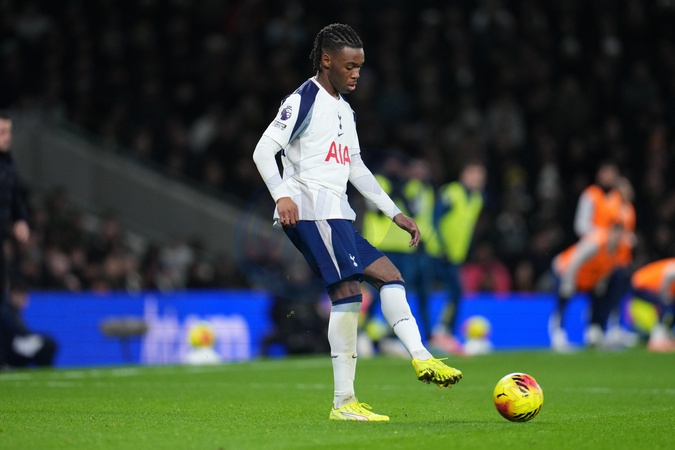 Destiny Udogie of Tottenham Hotspur makes pass backwards during the Premier League match Tottenham Hotspur vs Fulham at Tottenham Hotspur Stadium, London, United Kingdom, 29th November 2025, Credit:Harvey Murphy/News Images / Avalon