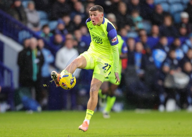 Alfie Devine of Preston North End controls the ball during the Sky Bet Championship match Sheffield Wednesday vs Preston North End at Hillsborough, Sheffield, United Kingdom, 29th November 2025, Credit:Richard Bierton/News Images / Avalon