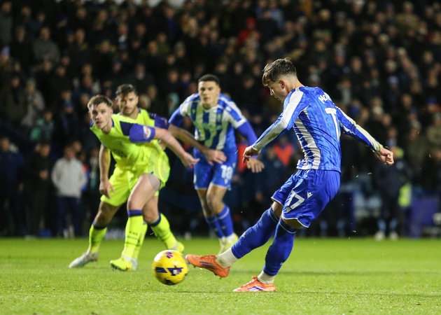 Charlie McNeill of Sheffield Wednesday takes penalty but finds his shot save by Preston North End goalkeeper Daniel Iversen during the Sky Bet Championship match Sheffield Wednesday vs Preston North End at Hillsborough, Sheffield, United Kingdom, 29th November 2025, Credit:Richard Bierton/News Images / Avalon