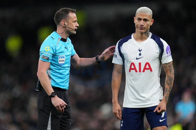 Richarlison of Tottenham Hotspur with referee Stuart Attwell during the Premier League match Tottenham Hotspur vs Fulham at Tottenham Hotspur Stadium, London, United Kingdom, 29th November 2025, Credit:Harvey Murphy/News Images / Avalon