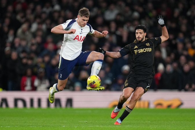 Micky van de Ven of Tottenham Hotspur wins ball off Raul Jimenez of Fulham during the Premier League match Tottenham Hotspur vs Fulham at Tottenham Hotspur Stadium, London, United Kingdom, 29th November 2025, Credit:Harvey Murphy/News Images / Avalon