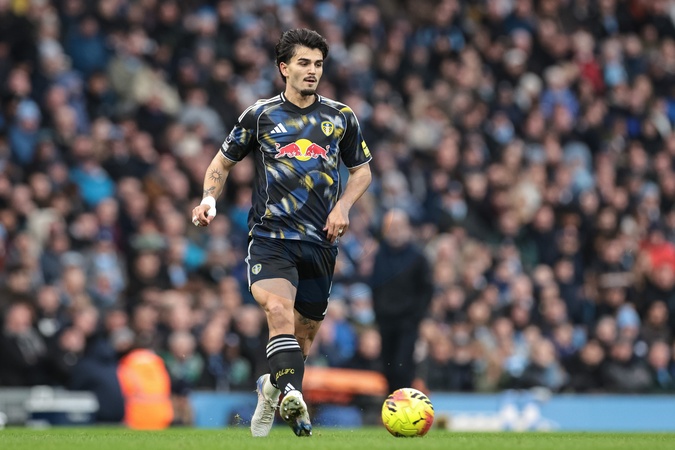 Pascal Struijk of Leeds United breaks with the ball during the Premier League match Manchester City vs Leeds United at Etihad Stadium, Manchester, United Kingdom, 29th November 2025, Credit:Mark Cosgrove/News Images / Avalon