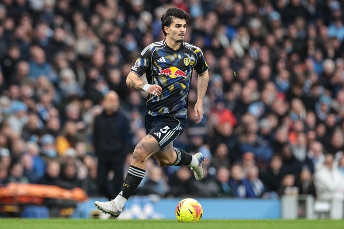 Pascal Struijk of Leeds United breaks with the ball during the Premier League match Manchester City vs Leeds United at Etihad Stadium, Manchester, United Kingdom, 29th November 2025, Credit:Mark Cosgrove/News Images / Avalon