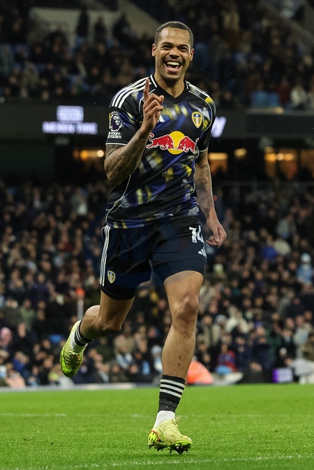 Lukas Nmecha of Leeds United celebrates his goal during the Premier League match Manchester City vs Leeds United at Etihad Stadium, Manchester, United Kingdom, 29th November 2025, Credit:Mark Cosgrove/News Images / Avalon