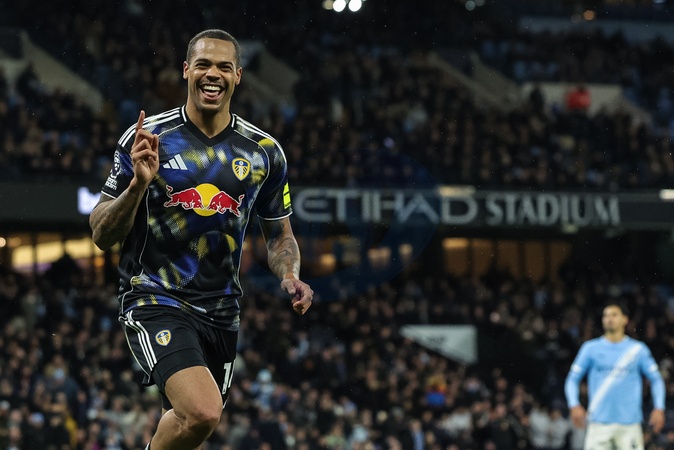 Lukas Nmecha of Leeds United celebrates his goal during the Premier League match Manchester City vs Leeds United at Etihad Stadium, Manchester, United Kingdom, 29th November 2025, Credit:Mark Cosgrove/News Images / Avalon