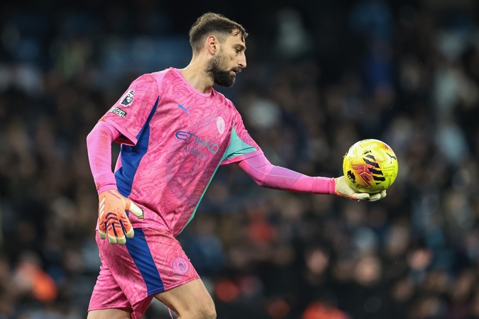 Manchester City goalkeeper Gianluigi Donnarumma with the ball during the Premier League match Manchester City vs Leeds United at Etihad Stadium, Manchester, United Kingdom, 29th November 2025, Credit:Mark Cosgrove/News Images / Avalon