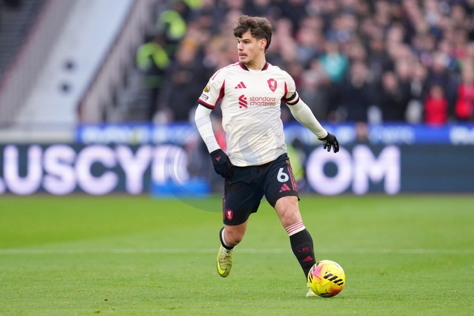 Milos Kerkez of Liverpool on the ball during the Premier League match West Ham United vs Liverpool at London Stadium, London, United Kingdom, 30th November 2025, Credit:Harvey Murphy/News Images / Avalon