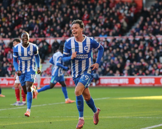 Maxim De Cuyper of Brighton & Hove Albion celebrates his goal to make it 0-1 during the Premier League match Nottingham Forest vs Brighton and Hove Albion at City Ground, Nottingham, United Kingdom, 30th November 2025, Credit:Richard Bierton/News Images / Avalon