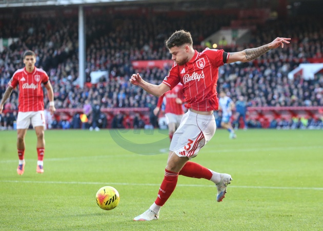 Neco Williams of Nottingham Forest clears the ball up field during the Premier League match Nottingham Forest vs Brighton and Hove Albion at City Ground, Nottingham, United Kingdom, 30th November 2025, Credit:Richard Bierton/News Images / Avalon