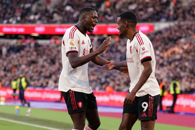 Alexander Isak of Liverpool and Ibrahima Konaté of Liverpool celebrate 0-1 lead during the Premier League match West Ham United vs Liverpool at London Stadium, London, United Kingdom, 30th November 2025, Credit:Harvey Murphy/News Images / Avalon