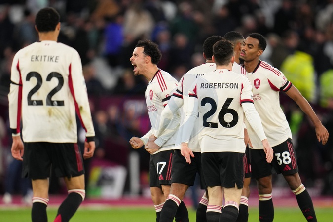 Liverpool players celebrate 0-2 lead during the Premier League match West Ham United vs Liverpool at London Stadium, London, United Kingdom, 30th November 2025, Credit:Harvey Murphy/News Images / Avalon