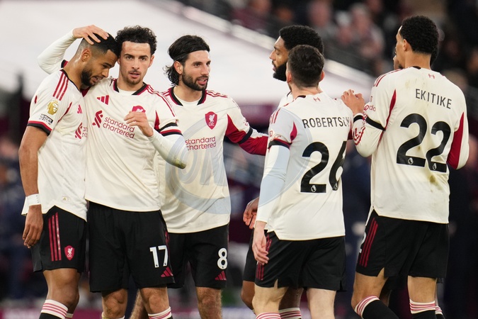 Liverpool players celebrate second goal during the Premier League match West Ham United vs Liverpool at London Stadium, London, United Kingdom, 30th November 2025, Credit:Harvey Murphy/News Images / Avalon