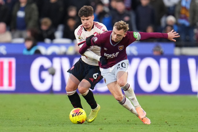Jarrod Bowen of West Ham United and Milos Kerkez of Liverpool battle for the ball during the Premier League match West Ham United vs Liverpool at London Stadium, London, United Kingdom, 30th November 2025, Credit:Harvey Murphy/News Images / Avalon