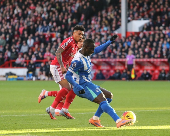 Yankuba Minteh of Brighton & Hove Albion crosses the ball during the Premier League match Nottingham Forest vs Brighton and Hove Albion at City Ground, Nottingham, United Kingdom, 30th November 2025, Credit:Richard Bierton/News Images / Avalon
