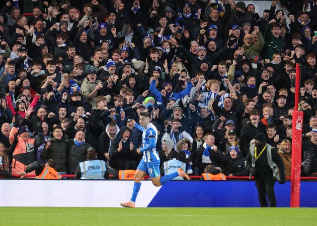 Stefanos Tzimas of Brighton & Hove Albion celebrates his goal to make it 0-2 during the Premier League match Nottingham Forest vs Brighton and Hove Albion at City Ground, Nottingham, United Kingdom, 30th November 2025, Credit:Richard Bierton/News Images / Avalon