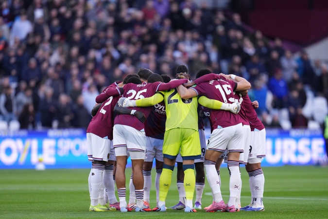 West Ham players huddle ahead of kick off during the Premier League match West Ham United vs Liverpool at London Stadium, London, United Kingdom, 30th November 2025, Credit:Harvey Murphy/News Images / Avalon