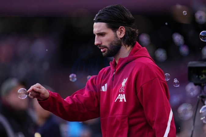Dominik Szoboszlai of Liverpool pops West Ham bubble ahead of kick off during the Premier League match West Ham United vs Liverpool at London Stadium, London, United Kingdom, 30th November 2025, Credit:Harvey Murphy/News Images / Avalon