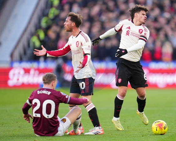 Milos Kerkez of Liverpool after decision goes against Liverpool during the Premier League match West Ham United vs Liverpool at London Stadium, London, United Kingdom, 30th November 2025, Credit:Harvey Murphy/News Images / Avalon