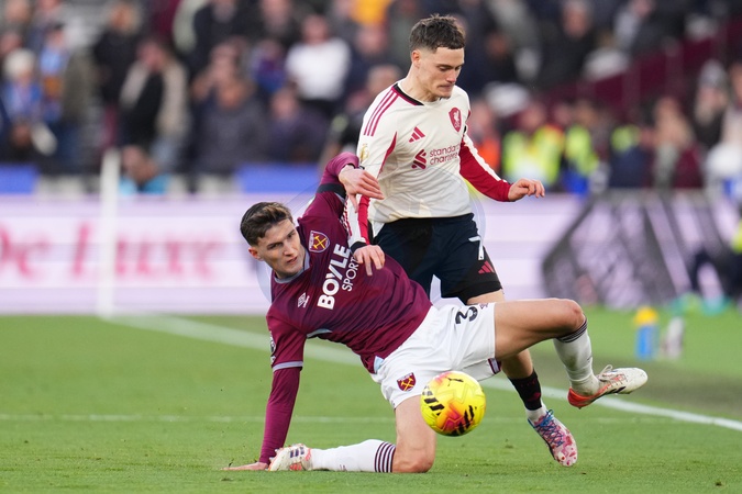 Florian Wirtz of Liverpool and Freddie Potts of West Ham United during the Premier League match West Ham United vs Liverpool at London Stadium, London, United Kingdom, 30th November 2025, Credit:Harvey Murphy/News Images / Avalon