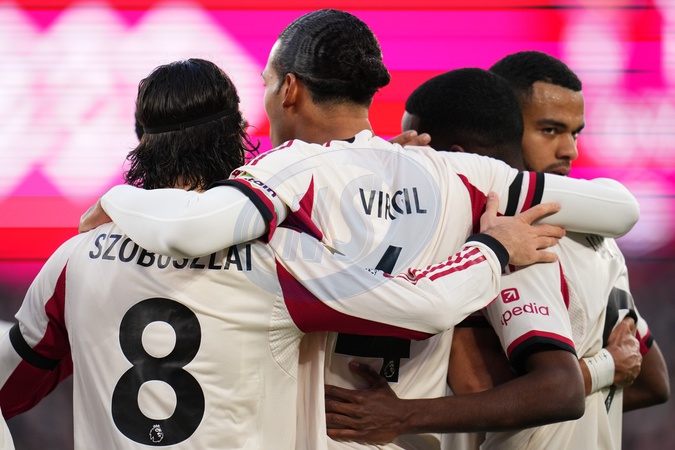Liverpool players celebrate 0-1 lead during the Premier League match West Ham United vs Liverpool at London Stadium, London, United Kingdom, 30th November 2025, Credit:Harvey Murphy/News Images / Avalon