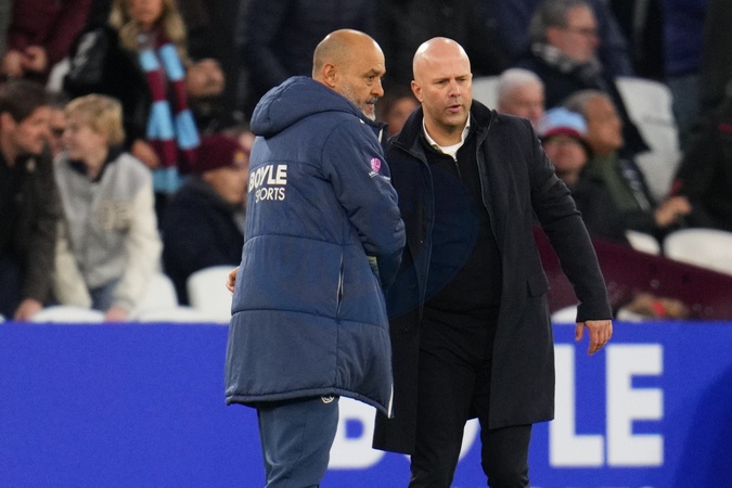 Arne Slot manager of Liverpool and Nuno Espirit Santo manager of West Ham United at full time during the Premier League match West Ham United vs Liverpool at London Stadium, London, United Kingdom, 30th November 2025, Credit:Harvey Murphy/News Images / Avalon