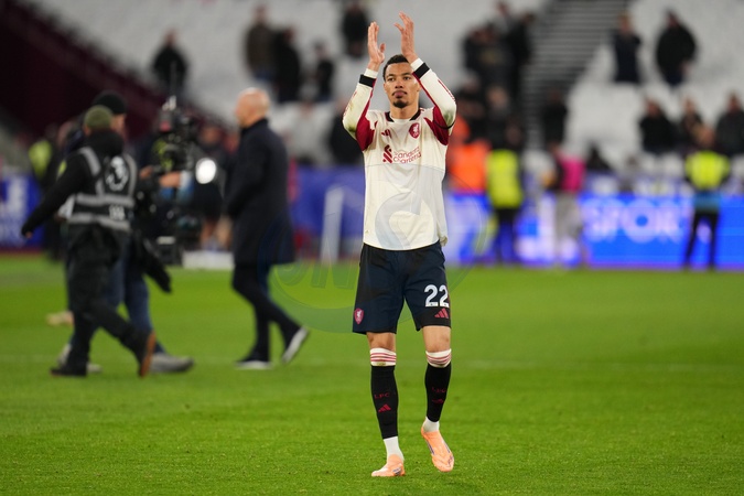 Hugo Ekitike of Liverpool applauds away support during the Premier League match West Ham United vs Liverpool at London Stadium, London, United Kingdom, 30th November 2025, Credit:Harvey Murphy/News Images / Avalon