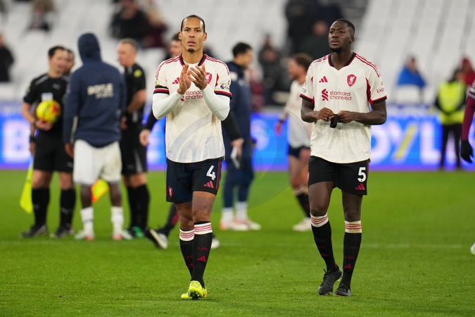 Virgil van Dijk of Liverpool and Ibrahima Konaté of Liverpool applaud away support during the Premier League match West Ham United vs Liverpool at London Stadium, London, United Kingdom, 30th November 2025, Credit:Harvey Murphy/News Images / Avalon