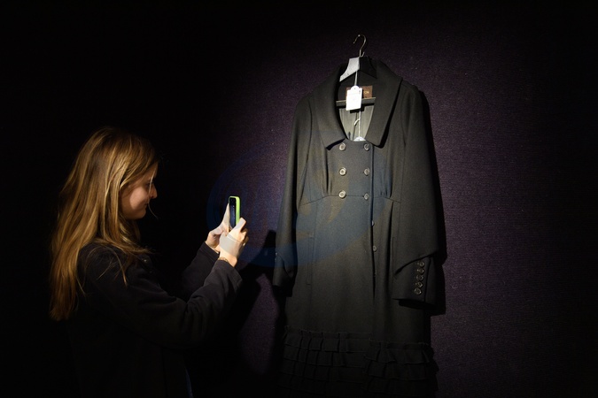 A staff member views A Louis Vuitton, Marc Jacobs Black Wool Coat owned by Marianne Faithfull (est. £300 - £500) which is on auction at Bonhams Sound & Cinema: With Property from The Marianne Faithfull Estate Sale ending from 3rd December 2025 at Bonhams in London, England, UK on Monday 1 December, 2025., Credit:Justin Ng / Avalon