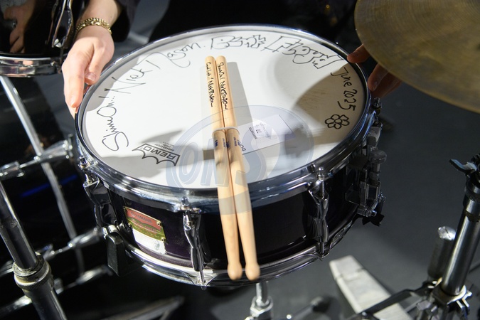 A staff member views A Yamaha 9000 Recording Custom Drum Kit and drumsticks both signed by Nick Mason (est. £4k - £6k) which is on auction at Bonhams Sound & Cinema: With Property from The Marianne Faithfull Estate Sale ending from 3rd December 2025 at Bonhams in London, England, UK on Monday 1 December, 2025., Credit:Justin Ng / Avalon