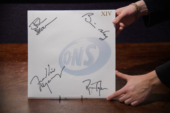 A staff member views 'The Complete Works Box Set With Autographed Sleeve, 1985' by Queen (est. £4k - £5k) which is on auction at Bonhams Sound & Cinema: With Property from The Marianne Faithfull Estate Sale ending from 3rd December 2025 at Bonhams in London, England, UK on Monday 1 December, 2025., Credit:Justin Ng / Avalon