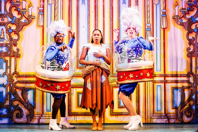 Siobhan James as Cinderella and Kat B and George Heyworth as the Ugly Sisters Flatula and Nausea in the Cinderella Panto at the Hackney Empire in London on 2 December 2025