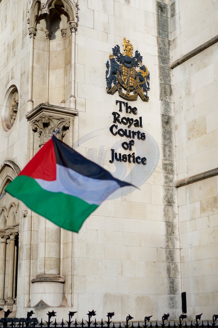 A small group of protesters outside the Royal Courts of Justice while, inside, lawyers representing co-founder Huda Ammori mount a legal challenge to the ban on Palestine Action. The hearing took place before Dame Victoria Sharp, Mr Justice Swift, and Mrs Justice Steyn on November 26, 27, and December 2, 2025. No immediate decision was issued. A written judgment is expected at a later date., Credit:Aldo Ciarrocchi 07942 340462 / Avalon