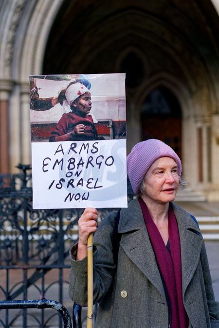 A small group of protesters outside the Royal Courts of Justice while, inside, lawyers representing co-founder Huda Ammori mount a legal challenge to the ban on Palestine Action. The hearing took place before Dame Victoria Sharp, Mr Justice Swift, and Mrs Justice Steyn on November 26, 27, and December 2, 2025. No immediate decision was issued. A written judgment is expected at a later date., Credit:Aldo Ciarrocchi 07942 340462 / Avalon