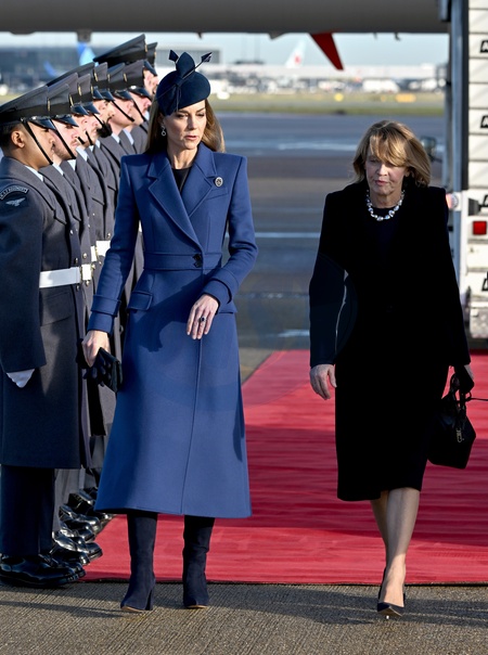 LONDON, ENGLAND - DECEMBER 03: Catherine, Princess of Wales (L) speaks with Elke Büdenbender, wife of the President of the Federal Republic of Germany Frank-Walter Steinmeier, as they arrive at Heathrow Airport on December 03, 2025 in London, England. The President of the Federal Republic of Germany, accompanied by Ms. Elke Büdenbender, are paying a State Visit to the United Kingdom as the guests of Their Majesties The King and Queen. The visit is the first from Germany in 27 years and will be marked with ceremonial visits, an address to the UK parliament and a banquet., Credit:Jeff Spicer / Avalon