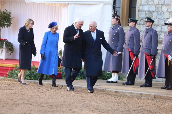 State visit of the President of Germany Frank-Walter Steinmeier along with his wife Elke Büdenbender visit Windsor Castle on day one of the state visit In the Quadrangle of Windsor Castle, a Guard of Honour will give a Royal Salute and theregimental Band will play the German and British National Anthems. The Federal President,accompanied by The King, will inspect the Guard of Honour, before rejoining The Queen and Ms.Büdenbender, together with The Prince and Princess of Wales, to view the military Rank andMarch past., Credit:Ian Vogler / Avalon