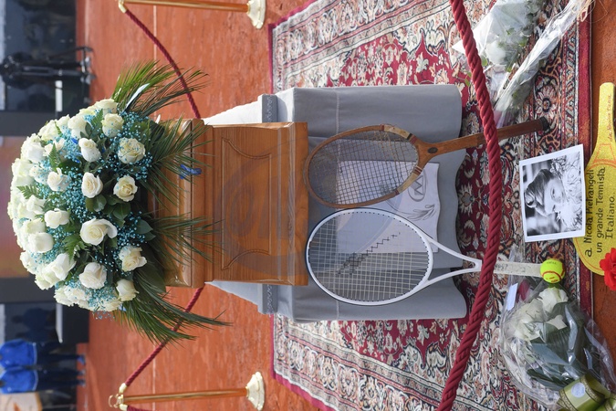 Nicola Pietrangeli's funeral chapel. Pictured is the coffin placed on the Pietrangeli court, the rackets Rome, Foro Italico, Dec 3rd 2025, Credit:Mimmo Chianura/AGF / Avalon