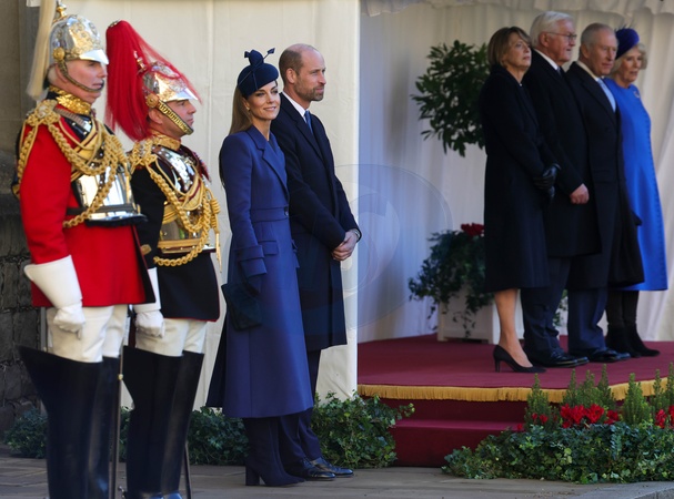 03/12/2025. Windsor, UK. In the Quadrangle of Windsor Castle, a Guard of Honour will gave a Royal Salute and the regimental Band played the German and British National Anthems. The Federal President, accompanied by The King, inspected the Guard of Honour, before rejoining The Queen and Ms. Büdenbender, together with The Prince and Princess of Wales, to view the military Rank andMarch past., Credit:Pete Maclaine / Avalon
