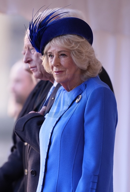 Queen Camilla during the ceremonial welcome at Windsor Castle, Berkshire, on day one of the state visit to the UK by the President of the Federal Republic of Germany. Picture date: Wednesday December 3, 2025., Credit:Andrew Matthews / Avalon