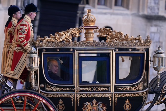 King Charles III arriving with German President Frank-Walter Steinmeier in the Irish State Coach to a ceremonial welcome at Windsor Castle, Berkshire, on day one of the state visit to the UK by the President of the Federal Republic of Germany. Picture date: Wednesday December 3, 2025., Credit:Andrew Matthews / Avalon