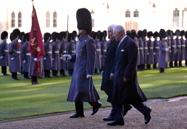 German President Frank-Walter Steinmeier and King Charles III inspect a Guard of Honour during the ceremonial welcome at Windsor Castle, Berkshire, on day one of the state visit to the UK by the President of the Federal Republic of Germany. Picture date: Wednesday December 3, 2025., Credit:Andrew Matthews / Avalon