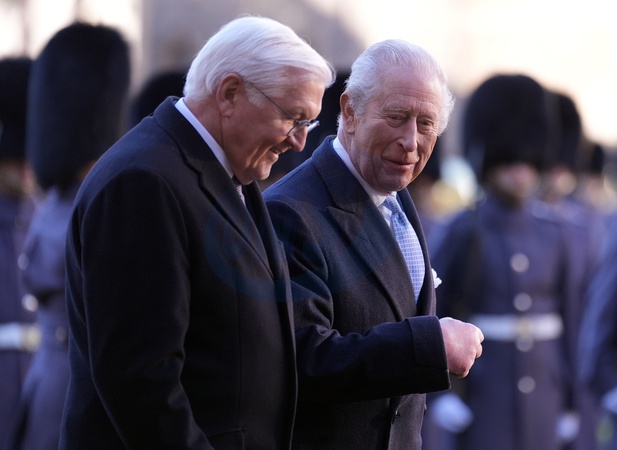 German President Frank-Walter Steinmeier and King Charles III after inspecting a Guard of Honour during the ceremonial welcome at Windsor Castle, Berkshire, on day one of the state visit to the UK by the President of the Federal Republic of Germany. Picture date: Wednesday December 3, 2025., Credit:Andrew Matthews / Avalon