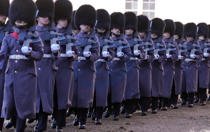 Grenadier guards march past the dais during the ceremonial welcome at Windsor Castle, Berkshire, on day one of the state visit to the UK by the President of the Federal Republic of Germany. Picture date: Wednesday December 3, 2025., Credit:Andrew Matthews / Avalon