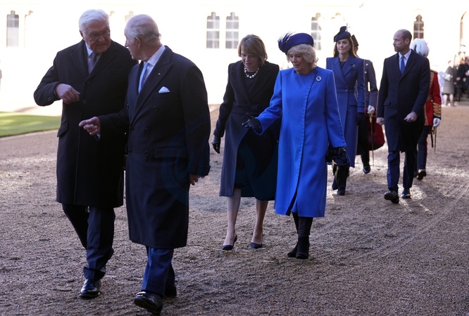 German President Frank-Walter Steinmeier and King Charles III, and Queen Camilla and Elke Budenbender during the ceremonial welcome at Windsor Castle, Berkshire, on day one of the state visit to the UK by the President of the Federal Republic of Germany. Picture date: Wednesday December 3, 2025., Credit:Andrew Matthews / Avalon
