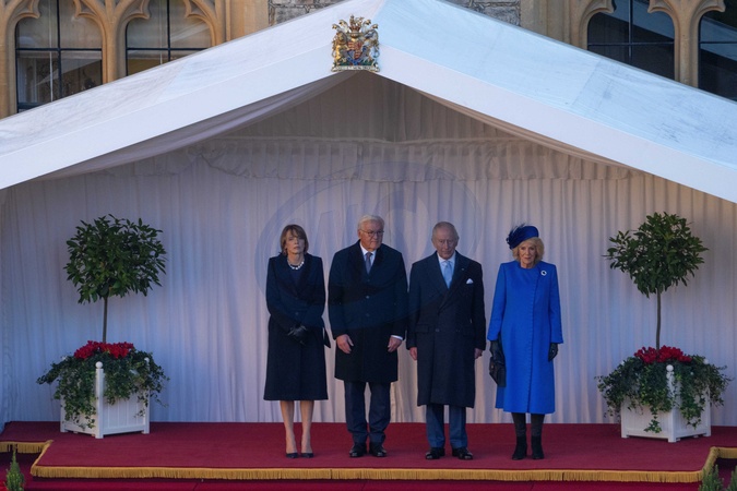 WINDSOR, ENGLAND - DECEMBER 03: King Charles III (2nd R) and Queen Camilla (R) with the President of the Federal Republic of Germany Frank-Walter Steinmeier (2nd L) and his wife Elke Büdenbender (L) as they watch a military procession during the ceremonial welcome for the state visit to the UK at Windsor Castle on December 03, 2025 in Windsor, England. The President of the Federal Republic of Germany, accompanied by Ms. Elke Büdenbender, are paying a State Visit to the United Kingdom as the guests of Their Majesties The King and Queen. The visit is the first from Germany in 27 years and will be marked with ceremonial visits, an address to the UK parliament and a banquet., Credit:Carl Court / Avalon