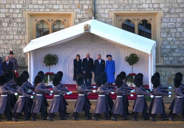 WINDSOR, ENGLAND - DECEMBER 03: King Charles III (second right) and Queen Camilla (R) with the President of the Federal Republic of Germany Frank-Walter Steinmeier and his wife Elke Büdenbender as they watch a military procession during the ceremonial welcome for the state visit to the UK at Windsor Castle on December 03, 2025 in Windsor, England. The President of the Federal Republic of Germany, accompanied by Ms. Elke Büdenbender, are paying a State Visit to the United Kingdom as the guests of Their Majesties The King and Queen. The visit is the first from Germany in 27 years and will be marked with ceremonial visits, an address to the UK parliament and a banquet., Credit:Carl Court / Avalon