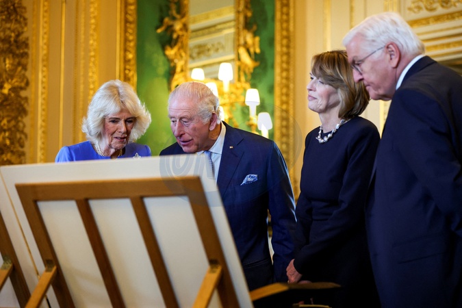 Britain's King Charles, Queen Camilla, German President Frank-Walter Steinmeier and his wife Elke Buedenbender view items on display relating to Germany, during a visit to the Royal Collection exhibition in the Green Drawing Room at Windsor Castle, during Steinmeier's state visit to Britain, in Windsor, Britain, December 3, 2025. REUTERS/Hannah, Credit:Hannah McKay / Avalon