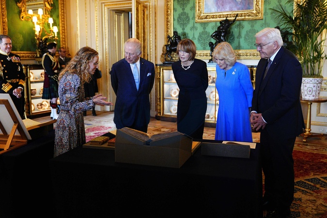King Charles III and Queen Camilla with German President Frank-Walter Steinmeier and his wife Elke Budenbender, view exhibits from the Royal Collection in the Green Drawing room at Windsor Castle, Berkshire, on day one of the state visit to the UK by the President of the Federal Republic of Germany. Picture date: Wednesday December 3, 2025., Credit:Aaron Chown / Avalon